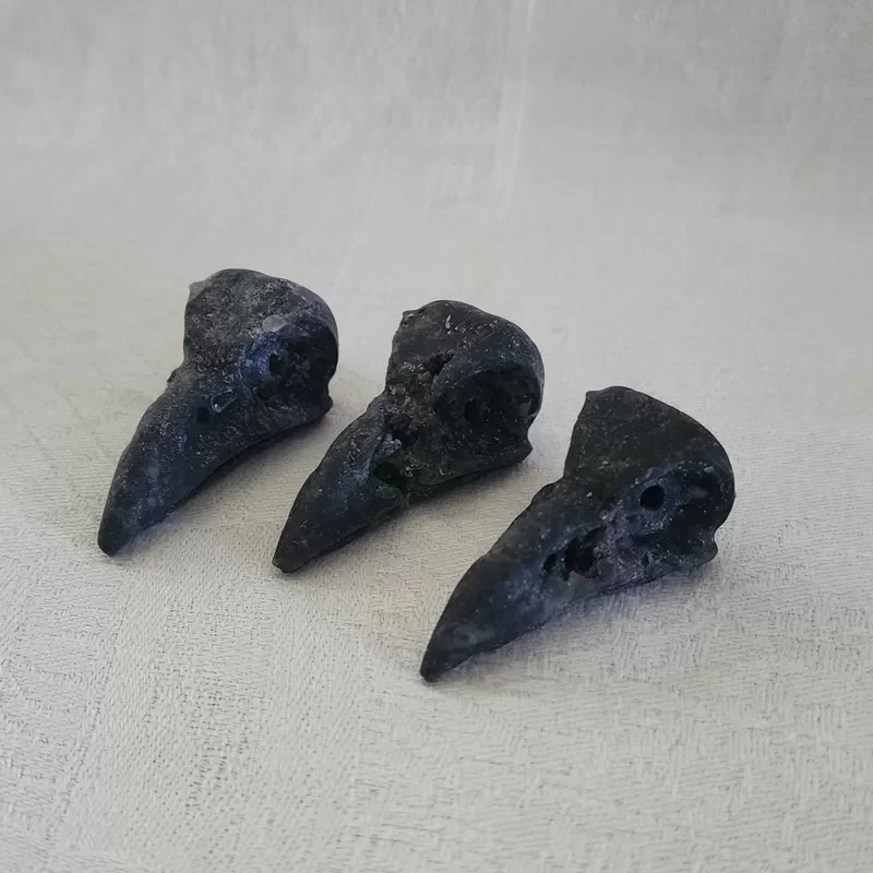 These lovely crow skulls have been carved out of an Agate Geode. They have a hole through the eyes so they may be strung for hanging or to wear as a pendant.