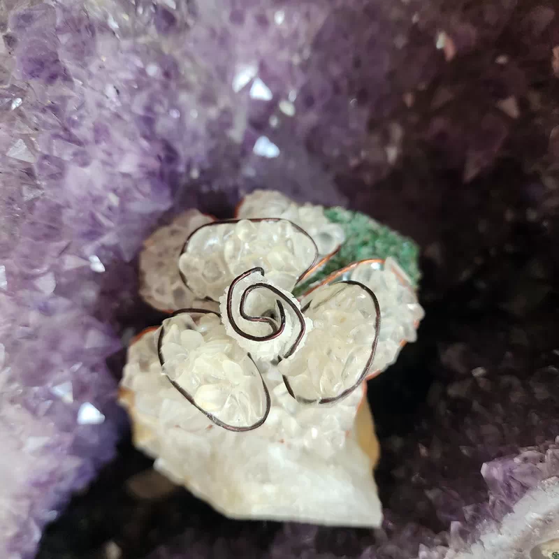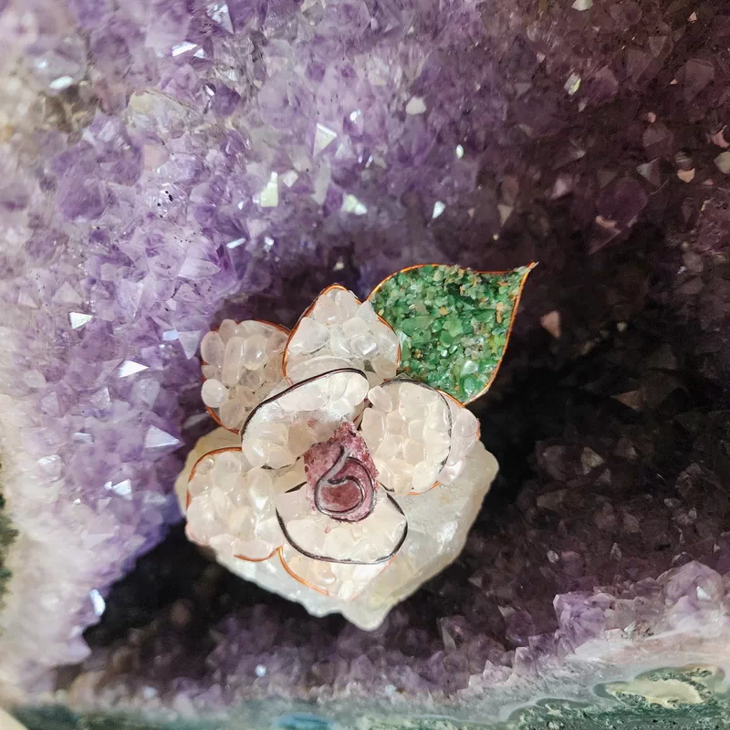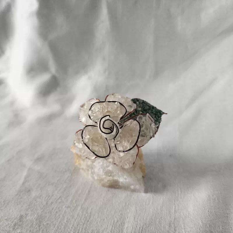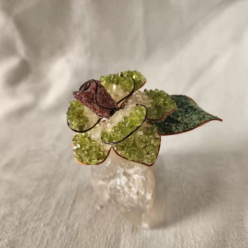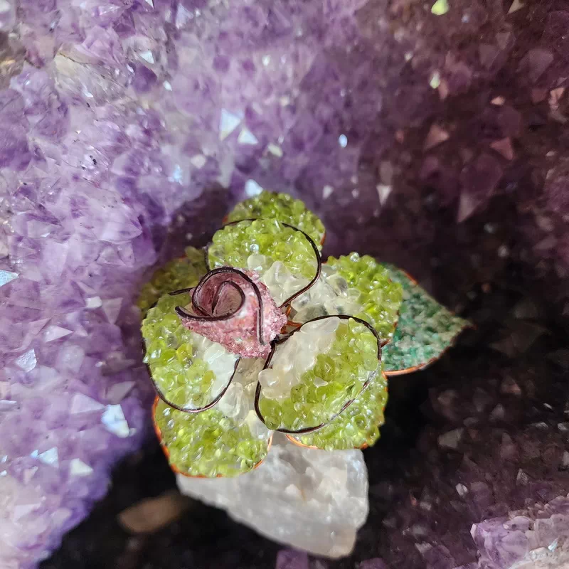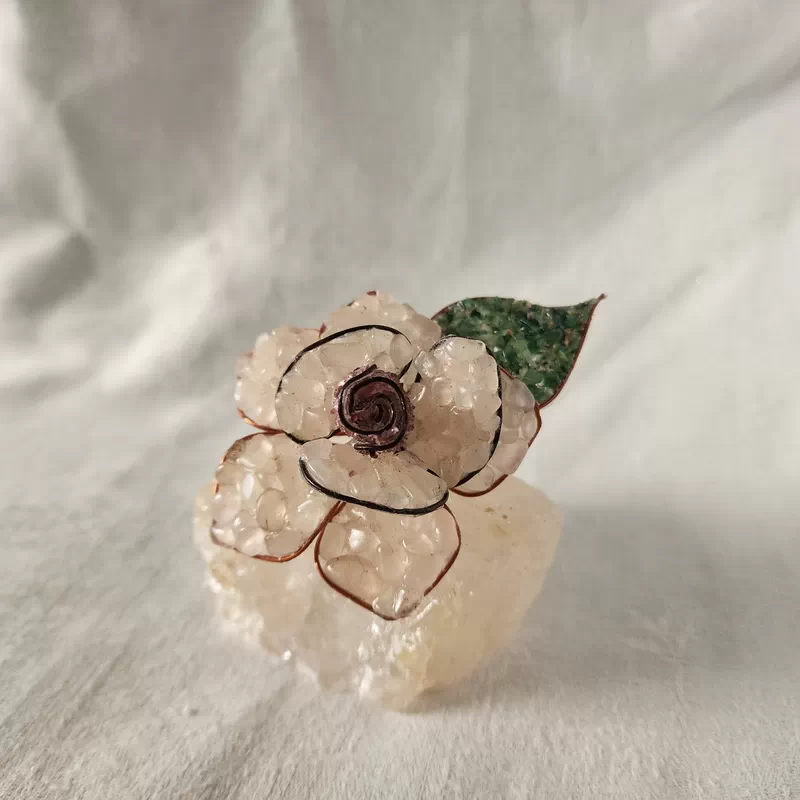 These Lovely single roses have been are mounted on a quartz base and are made by rural artists overseas using rose quartz, peridot, green aventurine, quartz and garnet gem pebble. They are very pretty and a unique gift or ornament for the home or office.