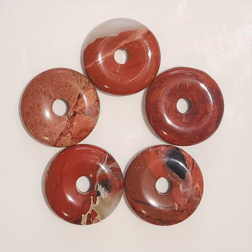 You will receive one of these Lovely Red Jasper Donut necklaces on a black velvet cord in a velvet pouch of your choice. Donuts spiritually are a symbol for the cycles of life, where in birth, death and re-birth are a continual cycle of a souls evolution here on the earth plane. They can also aid in the completion of a specific cycle of your life and have also been known to be worn to get the hag off your back which in certain circles is to repel and get rid of intentional and projected ill will, psychic attack and bindings used by black magic.